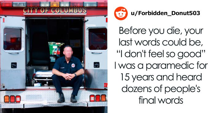 Before you die, your last words could be, “I don’t feel so good.” I was a paramedic for 15 years and heard dozens of people’s final words. The phrase I heard most often, possibly from half to three quarters of them, were some form of “I don’t feel so good.” I’ve also heard, “Wait, somethings wrong.” “Somethings happening.” “I don’t feel right.” “Wait, somethings wrong.” “It’s happening.” “Oh no, Oh no.” People feel the blood leaving their brain I think. Must be like a rush.