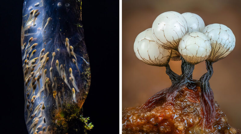 As imagens selecionadas deste ano abrangem 11 categorias e mostram uma variedade incrível de assuntos – desde a desova de sapos que lembra uma galáxia distante e um enxame fantasmagórico de efêmeras descendo sobre uma cidade húngara, até uma árvore coberta de gelo em Nagano e uma paisagem onírica criada pela oxidação de uma placa de cobre com materiais domésticos de uso diário.