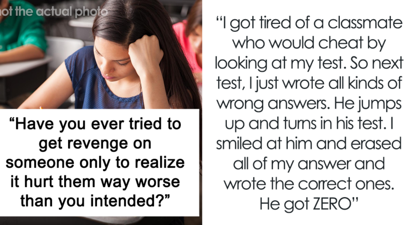 Students writing at desks in a classroom, focused on a task illustrating revenge plans causing unintended harm. I got tired of a classmate who would cheat by looking at my test. He was sort of a bully but I wasn’t a good target because I would fight back. I noticed that his math grades improved while sitting next to me and realized why…so next test, I just wrote all kinds of wrong answers, like off the way, he should have known they weren’t right…he jumps up and turns in his test. I smiled at him and erased all of my answer and wrote the correct ones. He got ZERO, and the teacher knew then something was up. He was subsequently made to do his tests alone in the corner of the room. Parents were called, the whole nine yards. I think he had to even repeat the class. I sort of felt bad that he got busted but fifth grade me was mean enough not to let it bother me for long, lol.