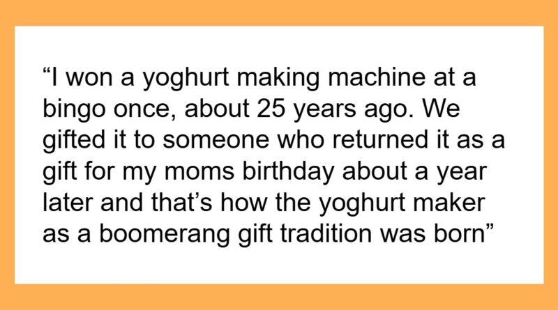 I won a yoghurt making machine at a bingo once, about 25 years ago. We gifted it to someone who returned it as a gift for my moms birthday about a year later and that’s how the yoghurt-maker-as-a-boomerang-gift tradition was born. Birthdays, weddings, graduations, whatever the occassion! Sometimes we forget who got it last and it pops up as a surprise for some type of celebration or anniversary. The box has never been opened, but we wrap it in different sized boxes now so the shape doesn’t give it away. My brother’s in-laws have been added to the family tradition too and received the yoghurt maker for their 40-something wedding anniversary. They loved the joke but their family, who weren’t in on the thing, thought we were really weird and cheap for getting them such a terrible gift. The funny thing is that we are all somewhat attached to the stupid thing now, that once my parents house suffered damage by a fire once, my brother and I, on separate occassions, both asked if the yoghurt maker survived. Weird but lovely tradition!