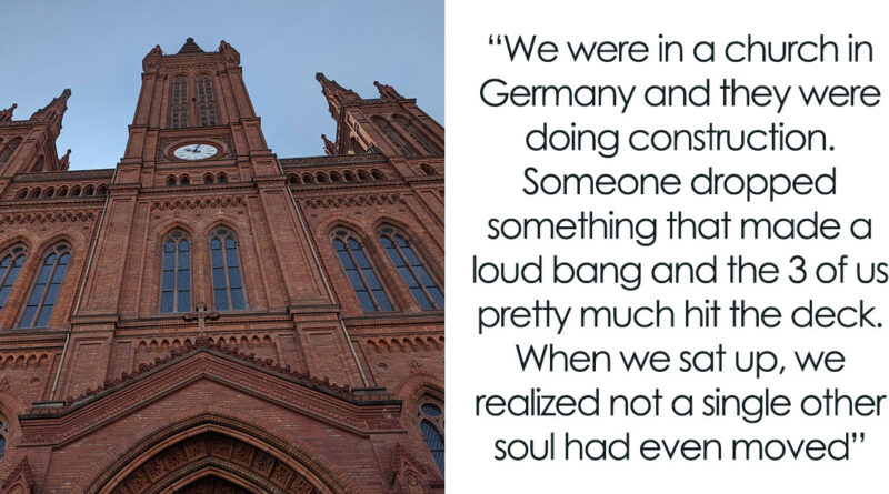 Just last year, my husband I took our grandmas (all from the US) to Europe. My husband, my grandma and myself were in a church in Germany and they were doing some construction. Someone dropped something that made a loud bang and the 3 of us pretty much hit the deck. When we sat up, we realized not a single other soul had even moved or were concerned about the bang. Took me a while to get over that one.
