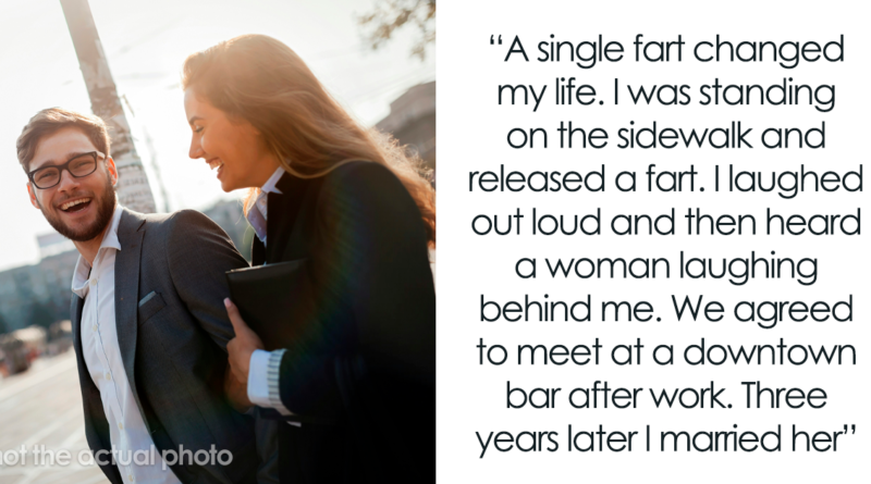 It is childish but a single fart changed my life. In 2013 I was working in the lobby of a downtown bank. Things were slow and I was trying to tidy up the lobby. I had to pass gas so I stepped outside the building. I was standing on the sidewalk and made sure no one was around. I released the fart and it was loud lol. I laughed out loud and then heard a woman laughing behind me. I turned around in horror and there was a woman who had just come around the corner and was walking. I was so embarrassed. So I apologized to her and she told me to stop saying sorry because she thought it was funny. I had never met a woman like that. Well she stopped to talk for a few minutes and I found out she worked at a corporate building a couple of blocks over. We agreed to meet at a downtown bar after work. Three years later I married her.