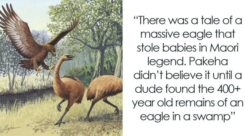 There was a tale of a massive eagle that stole babies in Maori legend. Pakeha (European settlers) didn’t believe it until at least after 1871 when a dude found the 400+ year old remains of an eagle in a swamp. They were 20-33 lb/9-15kg and had a 8.5-10 foot/2.4-3m wingspan.