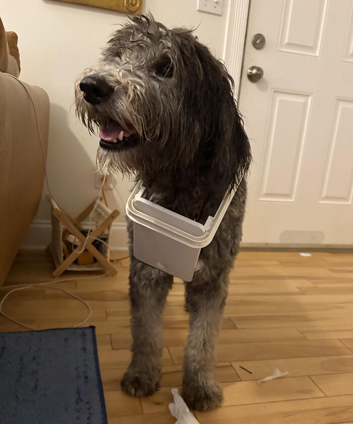 # 14 Fazia um tempo que não via Milo, então o pequeno criminoso desce as escadas com um novo colar, também conhecido como tampa de lixo do banheiro