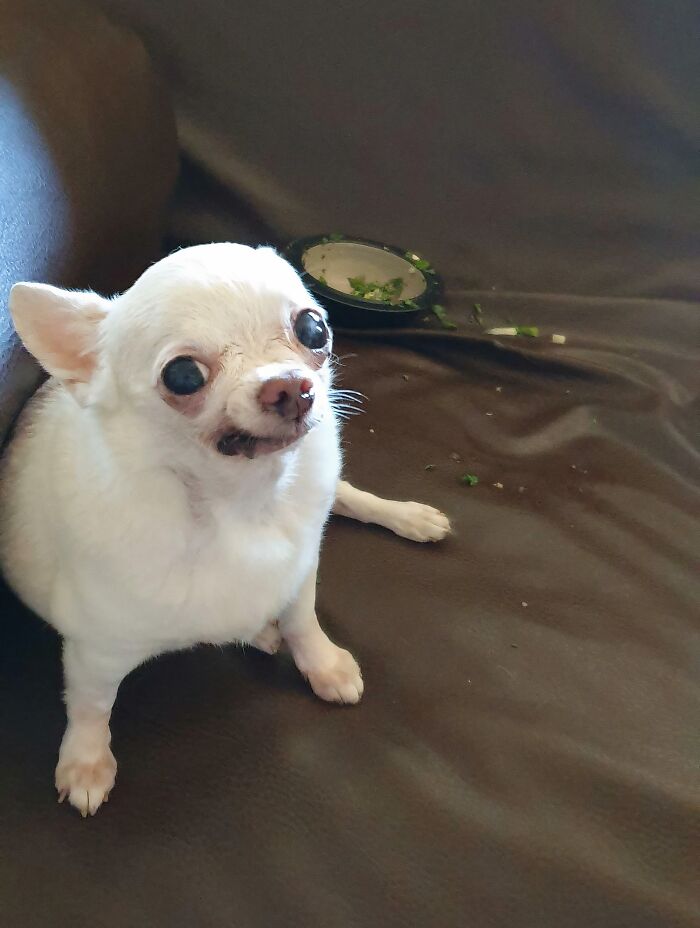 Sempre que ele se mete em problemas, ele “sorri” por falta de palavra melhor. É como se ele estivesse fazendo uma careta em todo o rosto… e isso derrete meu coração. Meu cão de apoio emocional, que nunca se candidatou ao cargo – amo você, Remi.