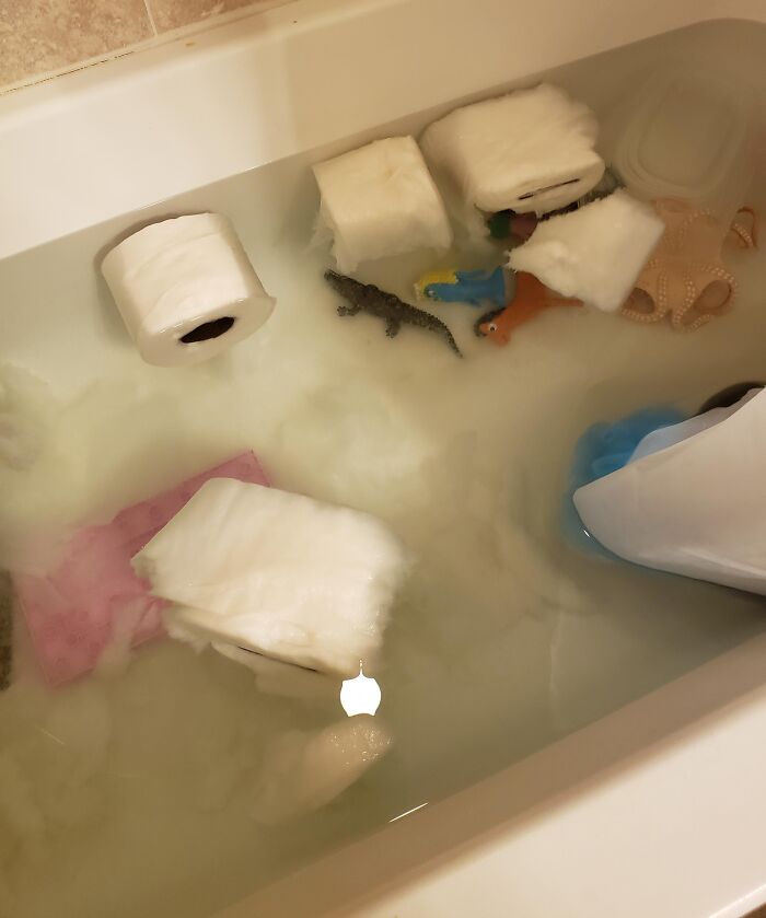 A irmã mais velha esqueceu de desligar a banheira ontem à noite depois do banho. Ele é treinado para usar o penico, foi antes de dormir e eu peguei isso esta manhã. As coisas acontecem, mas agora estamos com pouco papel!