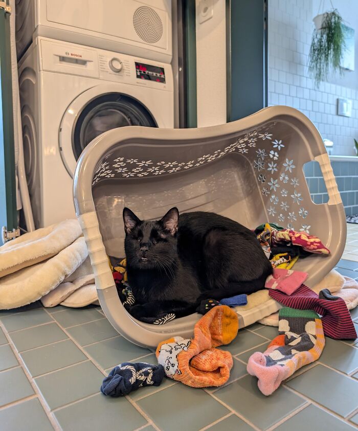 # 46 Ele derrubou o cesto de roupa suja para reivindicá-lo como cama