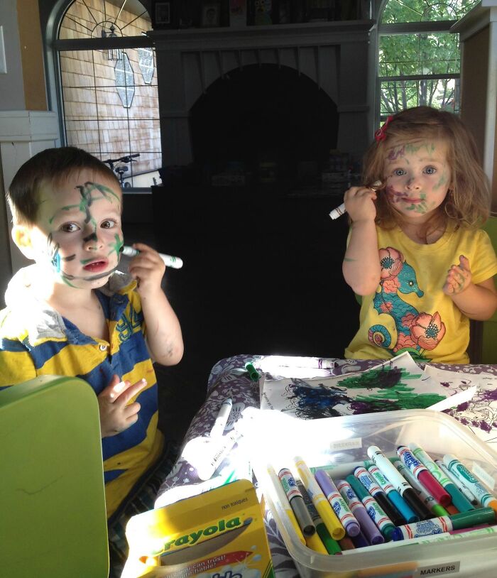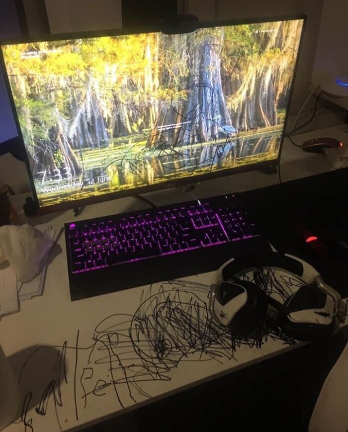 Quando o pano molhado não funcionou, esse garotinho fez o possível para esconder as evidências do crime – claramente sem perceber que isso em si era um crime. Em um movimento bastante engenhoso, ele pegou um marcador de tinta acrílica branca e tentou colorir o verde, pensando que isso resolveria o problema.