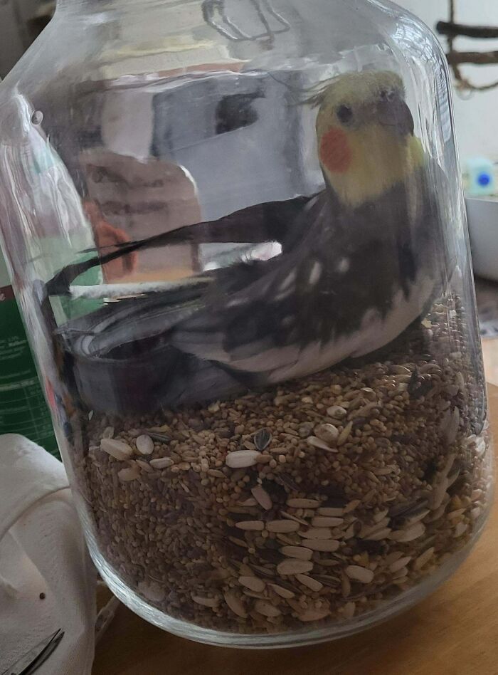 Queria dar algumas sementes aos meus pássaros como presente e esqueci de fechar o pote. Meu pequeno encrenqueiro, Smokey, resolveu invadir o pote e se servir de uma refeição farta, sem pensar em como vai sair dessa depois. Ele não é domesticado, então quando segurei meu dedo, ele simplesmente o atacou, então acabei tendo que inclinar o pote com cuidado para que ele pudesse sair.