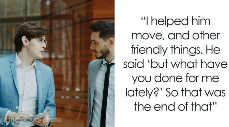 Two men in suits having a serious conversation indoors, illustrating friendships ending without even starting. I worked with a guy for a couple of years. I helped him move, and other friendly things. Once I asked him for help on an office task and he refused. So I said I have helped you before and he said “but what have you done for me lately ” so that was the end of that.