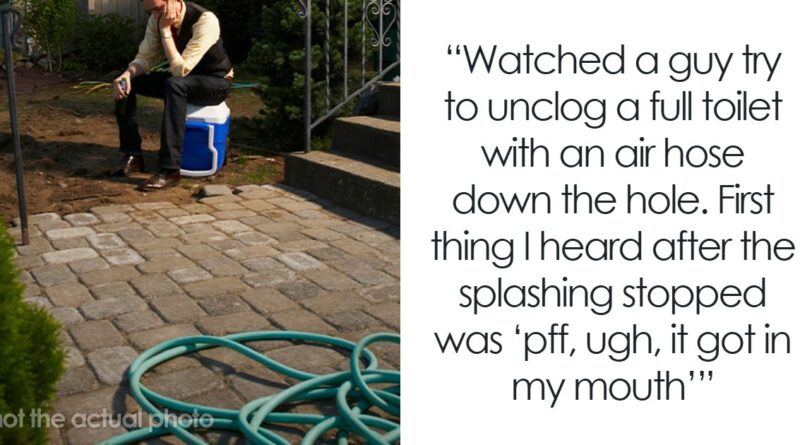 Man sitting on a cooler looking frustrated in a garden, illustrating coworker stupidity in a work or outdoor setting. Watched a guy try to unclog a full toilet with an air hose down the hole. First thing I heard after the splashing stopped was “pff, ugh, it got in my mouth.” I still crack up about that one.