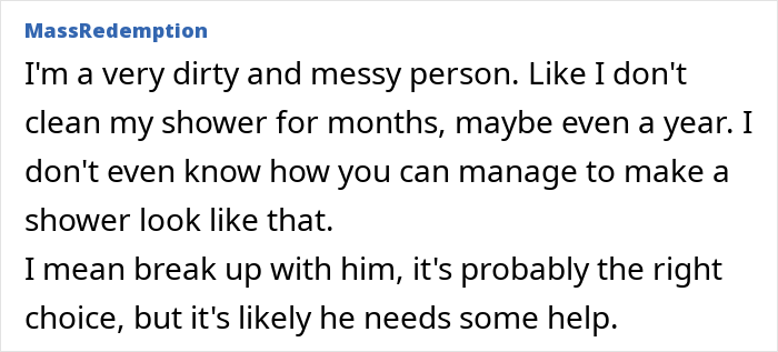 Então, uma mulher imediatamente considerou terminar com seu namorado por causa de como o chuveiro dele estava sujo