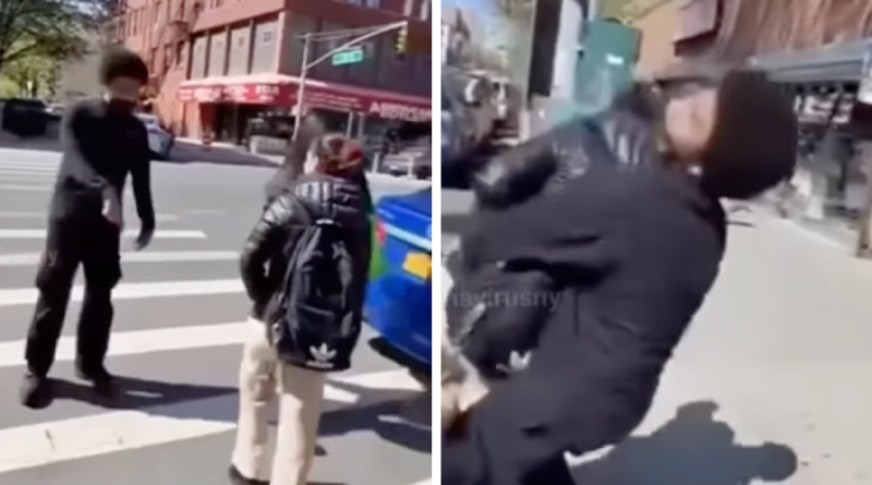 UM vídeo viral de Nova York captura um adolescente pisar na cabeça de uma garota no meio da rua.