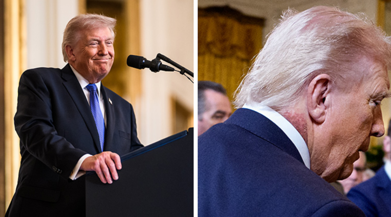 The White House issued a similar statement, saying, “At the Board of Peace event today in Davos, President Trump hit his hand on the corner of the signing table, causing it to bruise.”