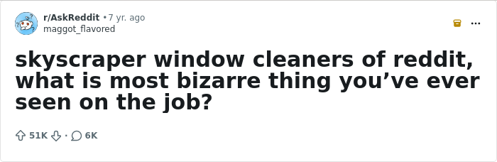 Have you ever been curious about what exactly they see? Well, now is your chance to find out, because we’ve collected the most interesting and juicy answers from two online threads where netizens asked: “Skyscraper window cleaners, what is [the] most bizarre thing you’ve ever seen on the job?” So, if you like reading about other people’s business, this might be just the one for you!
