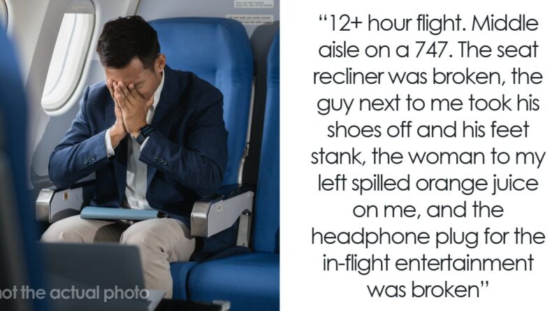 “His Feet Stank”: 57 Times People Wished They Could Just Exit The Plane 12+ hour flight. Middle aisle on a 747. The seat recliner was broken, the guy next to me took his shoes off and his feet stank, the woman to my left spilled orange juice on me, and the headphone plug for the in-flight entertainment was broken.