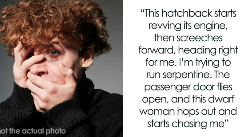 That’s when the passenger door flies open and this dwarf woman with blonde hair hops out and starts chasing me. She’s yelling, “Hey, you! What are you doing? Come here!”
