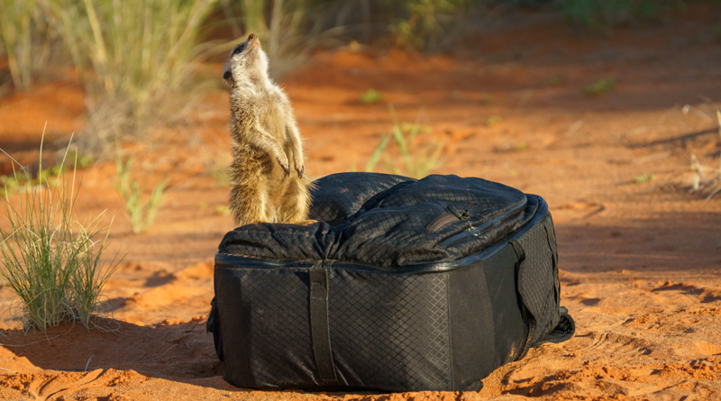 Um dos meus momentos favoritos! Eu estava rastejando na areia quando senti pezinhos nas costas, depois nos ombros e na cabeça. Um suricato decidiu que minha cabeça era o lugar perfeito para ficar de vigia! Durante dez minutos, uma pequena sentinela ficou de pé sobre minha cabeça, examinando o deserto em busca de predadores. Eu fazia oficialmente parte da equipe de segurança dos suricatos. Você pode ver um momento semelhante com a bolsa da minha câmera na foto. Acontece que os humanos são ótimas plataformas. Depois que o suricato subiu na minha cabeça, outro subiu no meu ombro. Ele não me tocou, apenas apoiou seu peso e ficou de pé. O suricato me usou como tripé vivo e parecia perfeitamente feliz. Meu amigo tirou uma foto minha, um fotógrafo empoeirado com um grande sorriso e um suricato muito sério no ombro. Totalmente normal, certo?