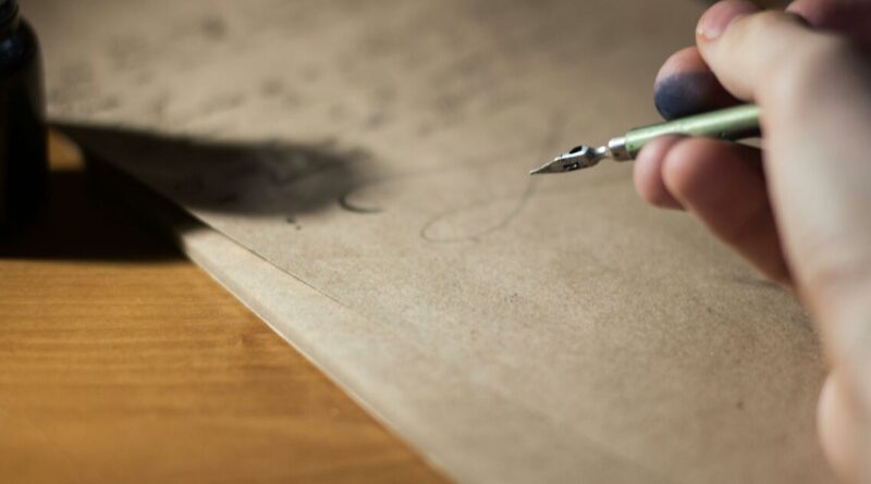 Mão segurando uma caneta-tinteiro preparada para escrever no papel, simbolizando um desafio de questionário em inglês e um teste de habilidades linguísticas.