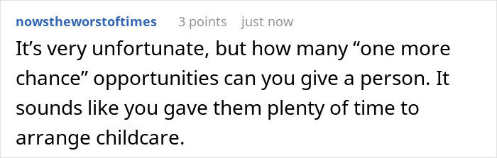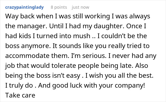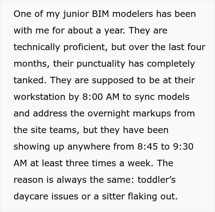 Um gerente recorreu a Internet para obter conselhos quando perceberam que precisavam demitir um funcionário que havia se tornado pai recentemente. O trabalhador chegava atrasado com tanta frequência e constantemente que fazia com que todos os outros ficassem até tarde para compensar. Os leitores compartilharam seus pensamentos e debateram a ética da situação.