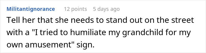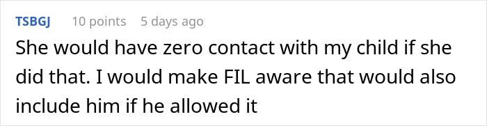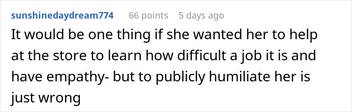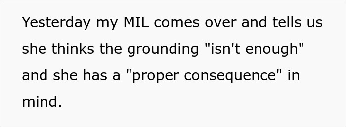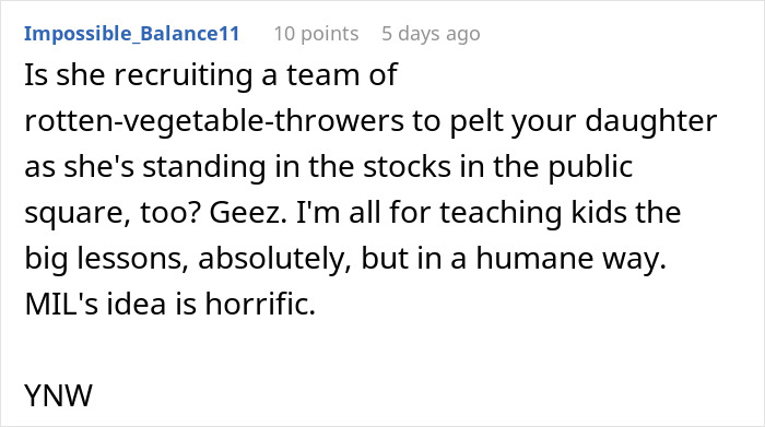 Uma mãe queria um segunda opinião depois de entrar em conflito com a sogra por causa da punição da filha. A filha foi pega furtando em uma loja, então a mãe a castigou, entre outras restrições. Então ela soube que sua MIL tinha um plano para humilhá-la publicamente, então ela teve que ameaçá-la para não mais visitá-la.