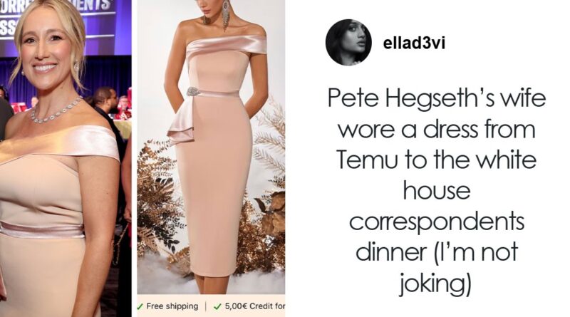 “Pete Hegeseth’s wife wore a dress from Temu to the white house correspondents dinner (I’m not joking),” she wrote, sharing a picture of the couple beside another snap of the dress, seemingly listed on the online marketplace.