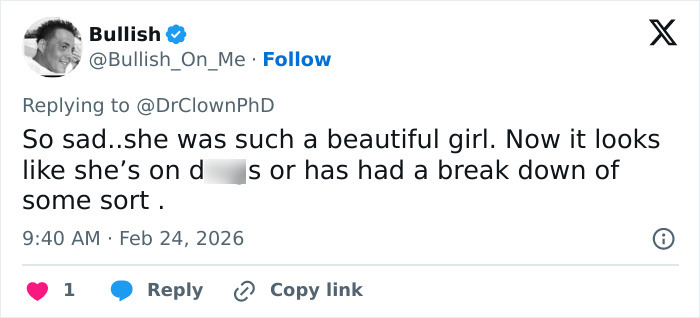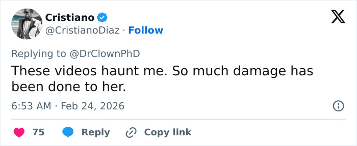 “A indústria a bagunçou tanto. É triste ver”, escreveu um deles. “Isso é tão triste de ver. Não tenho dúvidas de que alguma coisa pesada aconteceu com ela naquela indústria que a quebrou”, disse outro.