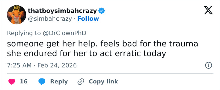 “Ela tem problemas de saúde mental. É muito óbvio. Ela precisa de ajuda”, escreveu uma pessoa. Outro disse: “Ela está tomando remédio?”