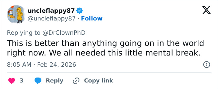 – Dr. Palhaço, PhD (@DrClownPhD) 24 de fevereiro de 2026
