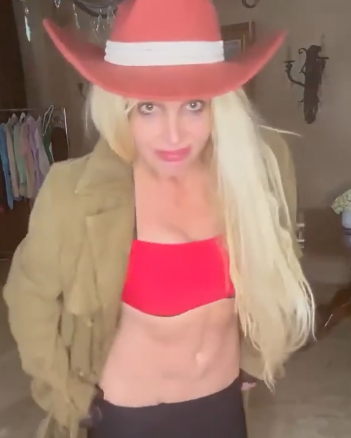 Ela também usava um sobretudo e um chapéu de cowboy no início do vídeo, que depois tirou. Spears exibiu alguns movimentos de dança antes de apontar o dedo médio para a câmera.
