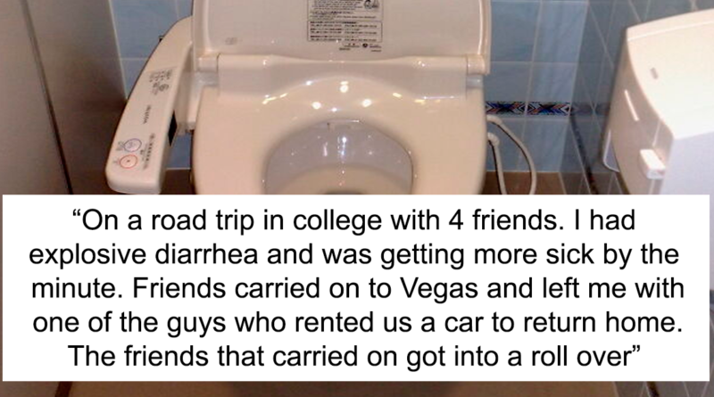 Modern Japanese toilet with bidet controls in a small tiled bathroom, illustrating a huge tactical nuke you dodged concept. On a road trip in college with 4 friends. We stopped halfway for a pit stop because I had explosive diarrhea and was getting more sick by the minute. Friends carried on to Vegas and left me with one of the guys who rented us a car to return home. The friends that carried on got into a roll over: 1 passed away, 2 will be injured for life.