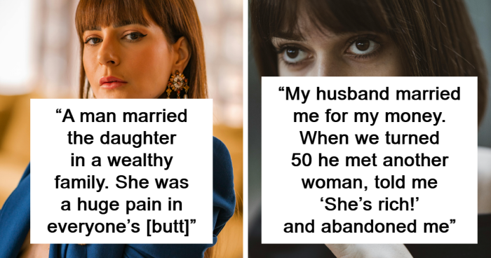 Still Depressed: 30 People Share What It’s Like To Be With Millionaires I’m pretty sure my husband married me for my money. I was 29 and feeling lonely. We were both science nerds. He was a doctor’s son, but he was really not financially supported. I was a bar owner’s daughter and far wealthier than he, although the money was parceled out to me in fairly small amounts but it supported us. Although I appeared to be the stay at home do nothing housewife to many I am sure, it was really my money supporting us and our three children. He did work but he had a serious debt creation problem with credit cards so his salary was never enough. When we turned 50 he met another woman, told me “She’s rich!” And abandoned me to basically poverty and food stamps. Lovely right? Fast forward two years, I tookmy half of his retirement account which was about 70k, and invested it and now I have close to a million. I’m shooting for 5 million. Oh yeah and now I don’t have to “discover” yet another maxed out credit card in my name ever again.