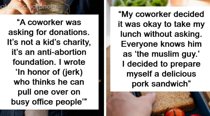 I recently started to work in an office. Not very happy about it, as I prefer working from home, but it’s only temporary so I’m hangin’ there. Since I’m trying to save money, I take my own lunch instead of eating at one of the many restaurants near the office. Soon after I started, I noticed my food going missing from the break room. After digging a bit, I discovered who the culprit was. One of my coworker, let’s call him “M”, decided it was okay to take my lunch without asking for almost a week. I had to put a stop to this, but since I had no hard evidence like a video of him eating my stuff, I decided to take justice in my own hands. You see, “M” is a muslim and apparently very serious about it. To the point that he has to let everyone know about this at least once a day. Nothing wrong with being serious about your religion, mind you. But when everyone knows you as “the muslim guy” because that’s the only thing you talk about, you may want to diversify your interests.