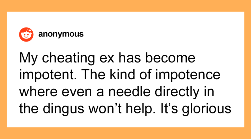 My cheating ex has become impotent. The kind of impotence where even a needle directly in the dingus won’t help. It’s glorious.