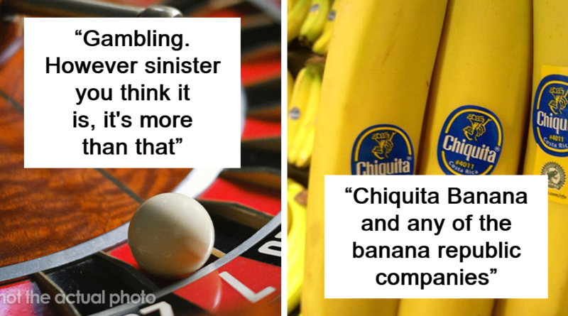 Chiquita Banana and any of the banana republic companies. These are companies that essentially bought entire countries in central America. Bought, paid for, and own all of the local utility companies, and they control the government. They’re all behind a lot of assassinations to control these countries and keep them company owned.
