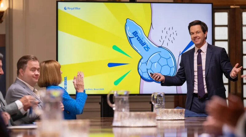 A essência: Elijah (Hauser) inventou um preservativo inovador que cobre ambos o wang e os yarbles, e Brad (Wahlberg) é o cara que vai vender tudo isso. O filme é incompleto sobre a ciência por trás deste produto – algo sobre os testículos serem “superespalhadores” de germes ou algo assim – mas provavelmente não deveríamos ficar muito presos a isso, porque as corporações tentam nos vender DORITOS NKD, meias sem glúten e outras variações inúteis de seus produtos o tempo todo, então esse novo profilático é pelo menos plausível. Elijah é um idiota nervoso que transpira nas solas dos sapatos enquanto apresenta o produto aos chefões da Regal Blue Condom Co.; Brad é um mega mentiroso entusiasta do tipo que lhe daria um aperto de mão muito firme e olharia diretamente nos seus olhos enquanto se declara com entusiasmo uma “pessoa sociável”. Então, esses caras são opostos yin-yang que seriam muito engraçados juntos se, digamos, acabassem perseguidos por turbas furiosas, sequestrados por um cartel e/ou flutuando pela Amazônia em uma jangada como Aguirre, se ele fosse tão idiota quanto louco. Teoricamente, pelo menos.
